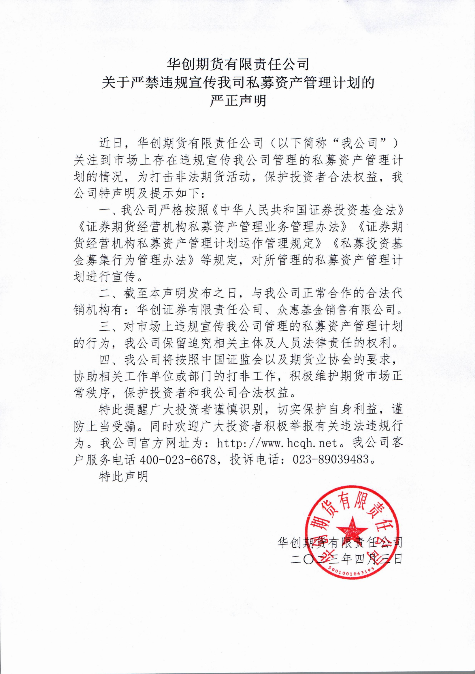 华创期货有限责任公司关于严禁违规宣传我司资产管理计划的严正声明